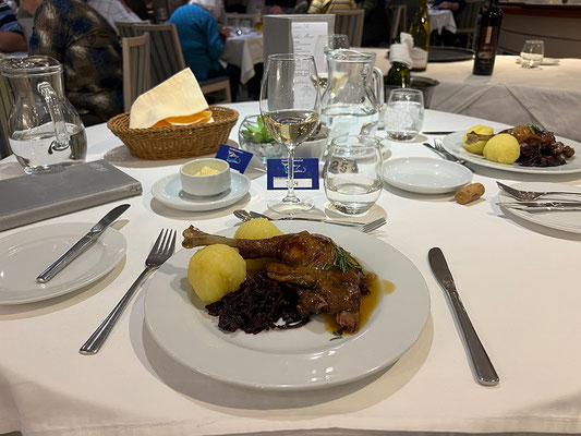 Bei traumhaftem Herbstwetter wurde die Fahrt nach Bratislava zu einem ganz besonderen Erlebnis. Während sich die MS Prinzessin Sisi gemächlich ihren Weg durch die malerische Flusslandschaft bahnte, genossen die Gäste ein festliches Menü mit köstlich zubereitetem Gansl mit Rotkraut und Kartoffelknödel. Die warme Herbstsonne und die in Goldtönen leuchtenden Uferlandschaften schufen die perfekte Kulisse für diesen genussvollen Ausflug.