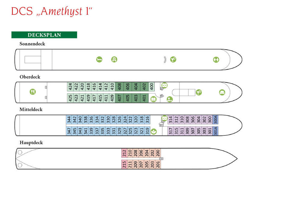 MS Amethyst 1 bietet 4 Passagierdecks, ein lichtdurchflutetes Panorama-Restaurant (eine Tischzeit), großzügige Aussichtslounge mit Bar und Tanzfläche, Foyer mit Rezeption (Safe). Boutique, Ausflugsbüro und Bibliothek mit Leseecke, Massage, Wäschereiservice.