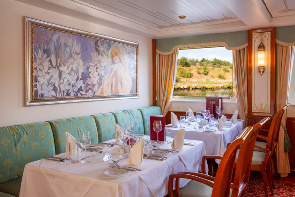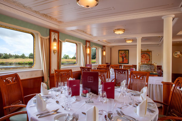 Das stilvolle Restaurant bietet ausreichend Platz für alle Gäste. Lassen Sie sich vom freundlichen Personal verwöhnen. Die Bordküche bietet schmackhafte internationale und deutsche Gerichte, die liebevoll präsentiert werden.