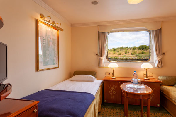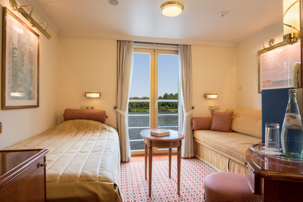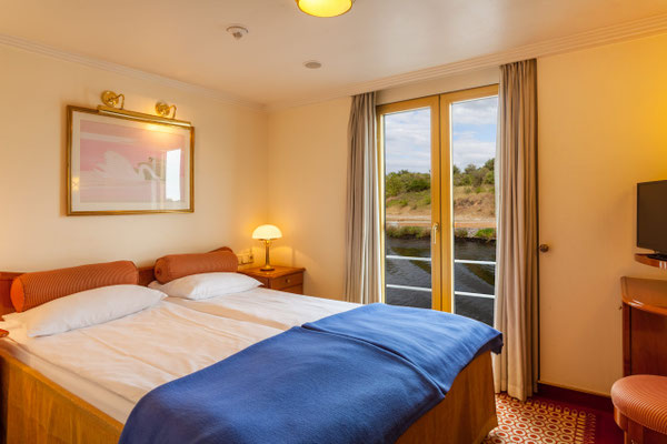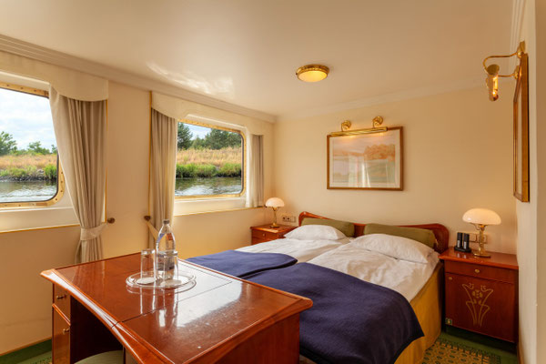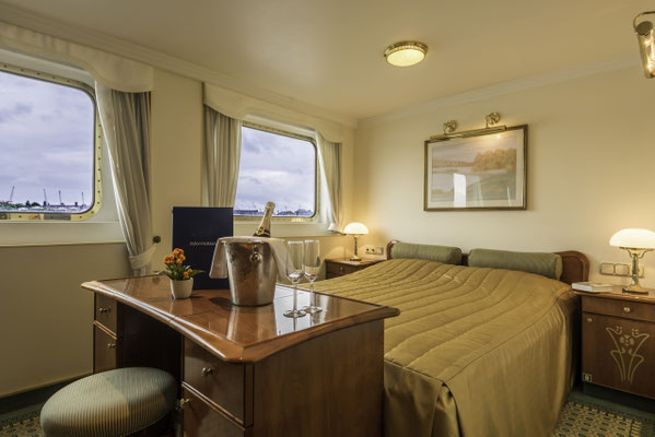Alle 42 Kabinen sind Außenkabinen und stilvoll eingerichtet. Auf dem Oberdeck sind alle Kabinen mit großen, bis zum Boden reichenden Panoramafenstern zum Öffnen ausgestattet (französischer Balkon). Die Hauptdeck-Kabinen haben nicht zu öffnende Fenster. Die Zweibett-Kabinen haben eine Größe von etwa 12 m², während die Deluxe-Kabinen ca. 13 m² und die Einbett-Kabinen ca. 9 m² groß sind. Alle Kabinen verfügen über eine individuell regulierbare Klimaanlage, Dusche/WC, Föhn, Musikkanal, SAT-TV, Safe, Kühlschrank und Telefon. Die Zweibett-Kabinen bieten entweder ein Doppelbett (1,50 m x 2,00 m) mit zwei Matratzen oder ein Sofabett und ein gegenüberliegendes, feststehendes Bett. Die Deluxe-Kabine 201 ist mit einem Sofabett und einem feststehenden Bett ausgestattet, während die Deluxe-Kabine 202 über ein Doppelbett mit zwei Matratzen verfügt. Die Einbett-Kabinen sind mit einem Sofabett ausgestattet.