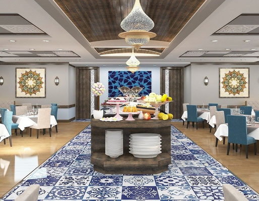 Vollpension mit internationaler sowie orientalischer Küche. Reichhaltiges Frühstücks- und Mittagsbuffet. Abendessen an abwechslungsreichem Buffet mit Themenabenden (italienisch, orientalisch, asiatisch).