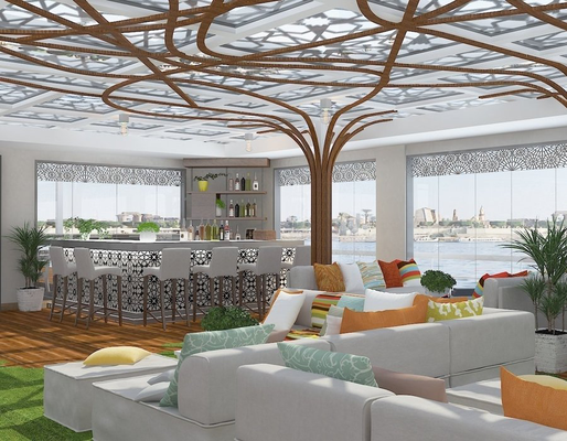 Sie verfügen über vier Decks mit Eingangsbereich inklusive Rezeption, Boutique, Massagebereich, einen exklusiv gestalteten Salon mit Bar, ein Restaurant, sowie einen Wäscheservice.