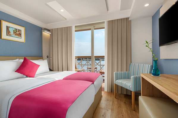 Die Kabinen (ca. 20 m²) auf dem mittleren Horusdeck sind mit einem französischen Balkon ausgestattet.