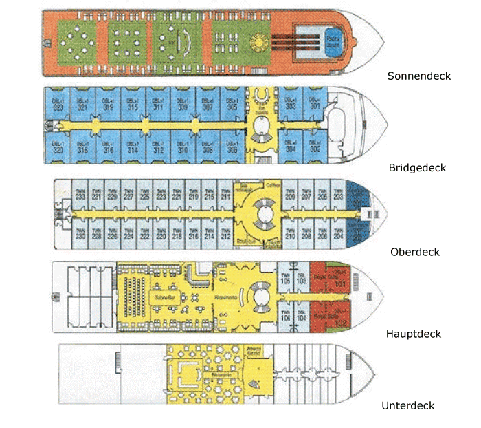 Die Schiffe verfügen über je 42 Kabinen. Alle Kabinen liegen außen, sind modern und komfortabel in Design und Ausstattung. Alle Kabinen verfügen über Sessel bzw. Sitzecke, Dusche/WC, Föhn, regulierbare Klimaanlage, SAT-TV, Musik-, Film- und Dokumentationskanal, Schiffstelefon, Privatsafe, Kabinenservice, Kühlschrank, Teekocher. 220 Volt Wechselstrom.