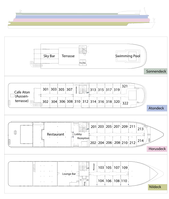 Die 2 im Jahre 2019 neu erbauten Nilkreuzfahrtschiffe MS Royal Vision und MS Crown Vision und die MS Nile Vision (Baujahr 2015) sind Schiffe der 5*Deluxe Kategorie und verfügen über 4 Passagierdecks mit Eingangshalle/Rezeption, einen Salon, ein Restaurant und Bars.