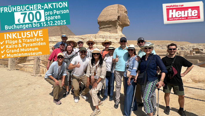 8 Tage Deluxe Kombination mit 3 Nächten in Kairo und 4 Nächten Nilkreuzfahrt auf dem 5*Deluxe Nilkreuzfahrtschiff Solaris I oder II in der Balkonkabine mit Vollpension inklusive Besichtigung der Pyramiden von Gizeh & Sphinx, das neu eröffnete Grand Museum (GEM), das Mumienmuseum, Zitadelle und Bazar inklusive Flügen Wien - Kairo - Luxor / Assuan - Kairo - Wien: Die Reise findet jede Woche Freitag bis 31. Dezember 2026